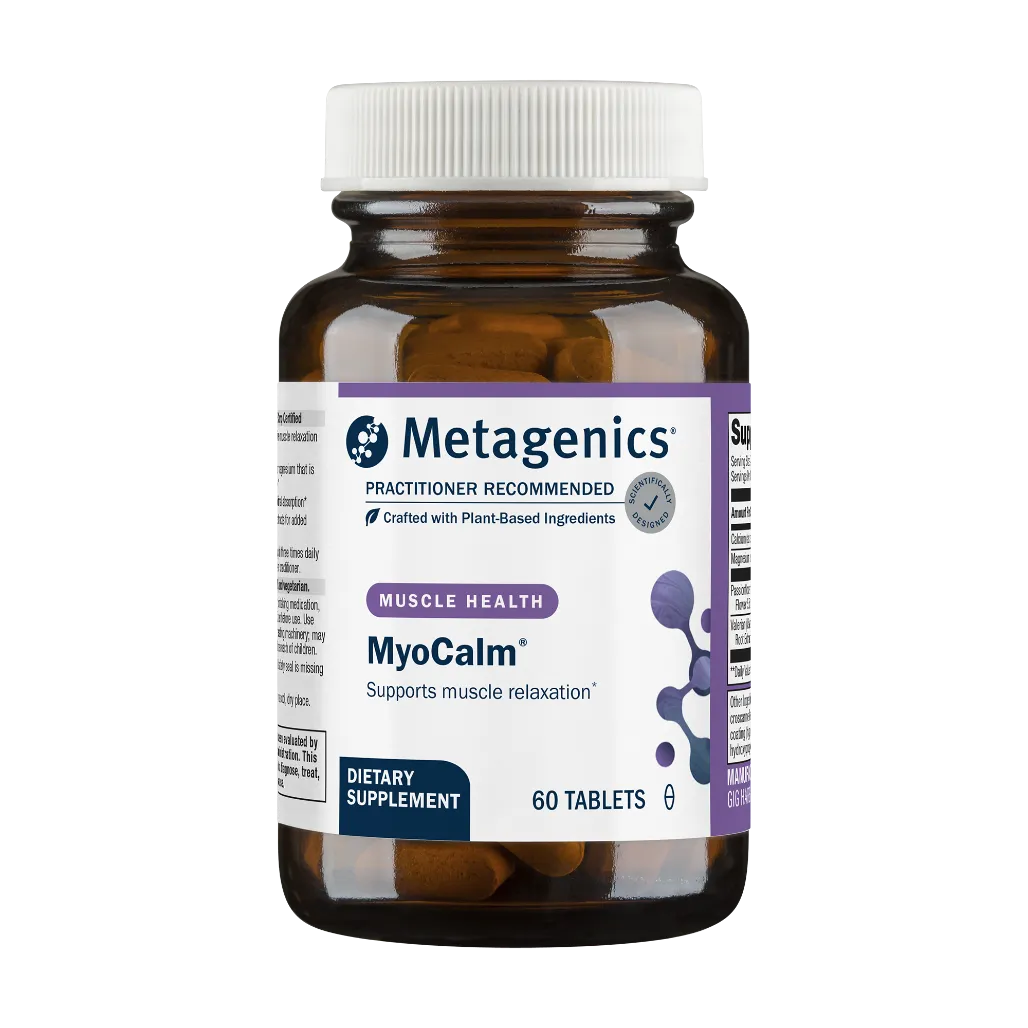 Metagenics MyoCalmis your solution to calming your muscles and reducing feelings of tension. Developed with passionflower and valerian for added relaxation support, this specialized formula supplies bioavailable forms of calcium and magnesium—which play a role in muscle contraction and relaxation—to deliver effective relief.With its vegetarian, non-GMO, and gluten-free ingredients, you can trust that you’re consuming natural, clean ingredients without added synthetic components.MyoCalm supplementis meant to be a dietary supplement for adults who want to find the perfect balance between relaxation and performance. It is made to work in harmony with the way our bodies work. Healthy tranquility is only minutes away when you take Metagenics MyoCalm daily.Product Info-Serving Size:2 TabletServings Per Container:30