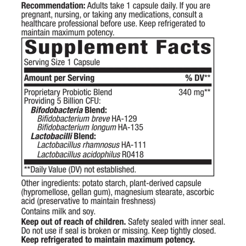 Probiotic capsules for adults with 5 billion CFUs per capsule & 4 strains of bacteria.
