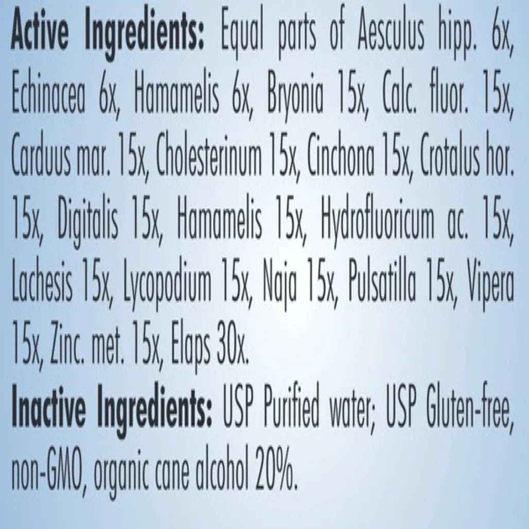 Homeopathic. Formulated for symptoms such as swelling, discoloration, aching and heaviness in legs.
