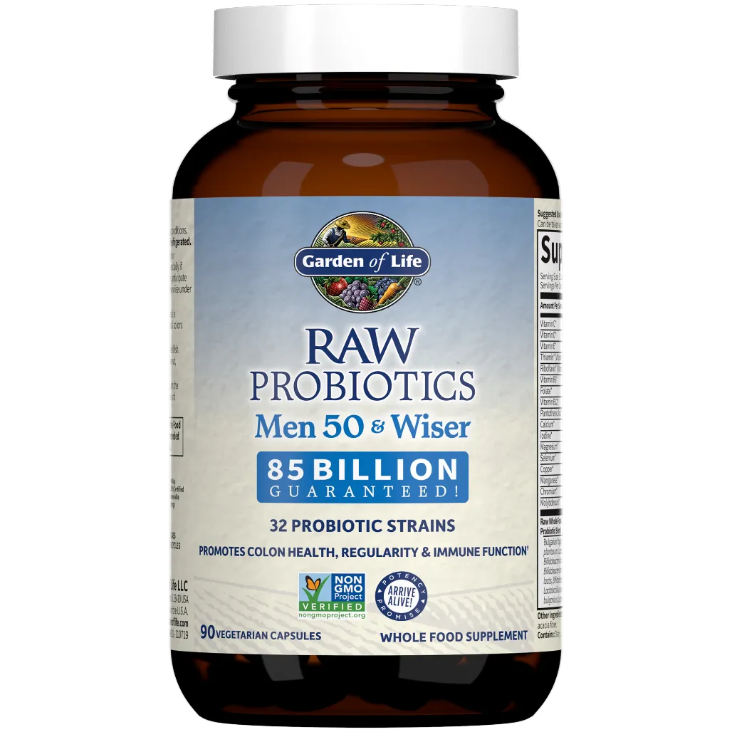 Garden of Life® RAW Probiotics Men 50 & Wiser is a RAW, full spectrum, whole food probiotic formula specifically designed to meet the unique needs of men over 50. RAW Probiotics Men 50 & Wiser offers 32 “original” probiotics, including L. fermentum and B. animalis sub. Lactis, specifically formulated for men over 50 to support immune function and support healthy cholesterol levels already in the normal range.* RAW Probiotics Men 50 & Wiser also delivers probiotic-created vitamins, minerals and prebiotics as well as dairy-digesting enzymes to help support the break down of lactose and casein.* RAW Probiotics Men 50 & Wiser goes Beyond Probiotics offering a broad range of benefits specifically targeted for men over 50. RAW means Garden of Life's probiotics are uncooked, untreated, unadulterated, with no binders or fillers and no carriers such as maltodextrin or dextrose. What you see on the label is what you get in the bottle—temperature-controlled cold storage and delivery from the moment the probiotic cultures are harvested until you swallow your first capsule—ensures that your probiotics Arrive Alive!™