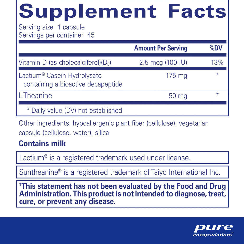 • Offers support for occasional stress with a blend of Lactium®, L-theanine and vitamin D.• Targets multiple actions on the HPA-axis with the clinically studied milk-based peptide Lactium® to promote relaxation, positive mood and other stress-related effects, including healthy digestion, sleep, and cardiovascular and cognitive function.• Promotes healthy immune support during occasional stress with L-theanine and vitamin D.Serving Size:1 Vegetable CapsuleServings Per Container:45
