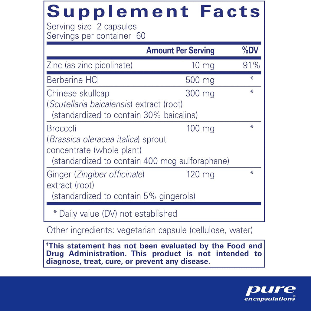 • Part of thePureResponse™Immune Protocol* for healthy immune balance and function.• Contains a blend of berberine, baicalin from Chinese skullcap, sulforaphane from broccoli, ginger, and zinc.• Maintains healthy immune biomarkers and cytokine balance related to cell tissue health and comfort.Serving Size:2 Vegetable CapsuleServings Per Container:60
