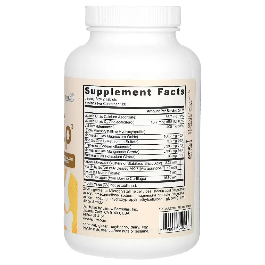 Ultra Bone-Up ® provides StimuCal™ ossein MicroCrystalline HydroxyApatite (MCHA) (from free-range New Zealand calves), which includes the superior combination of the inorganic calcium lattice of MCHA within an organic protein milieu. StimuCal™ is rich in native type I collagen—the predominant protein found in bone—and has been clinically demonstrated not to disproportionately spike calcium blood levels as do other forms of calcium, such as the citrate and carbonate salt forms.* StimuCal™ is combined with vitamin D3, vitamin K2 (as MK-7 from natural fermentation [a more bioavailable form of vitamin K]) and JarroSil® Activated Silicon® to support the deposition of calcium into the bones, as well as to assist in building up the organic bone matrix.* Also included are potassium citrate (systemic alkalizer) for optimal osteo support and Type II Collagen to support cartilage.* Bone Up® also supports cardiovascular and arterial health.*