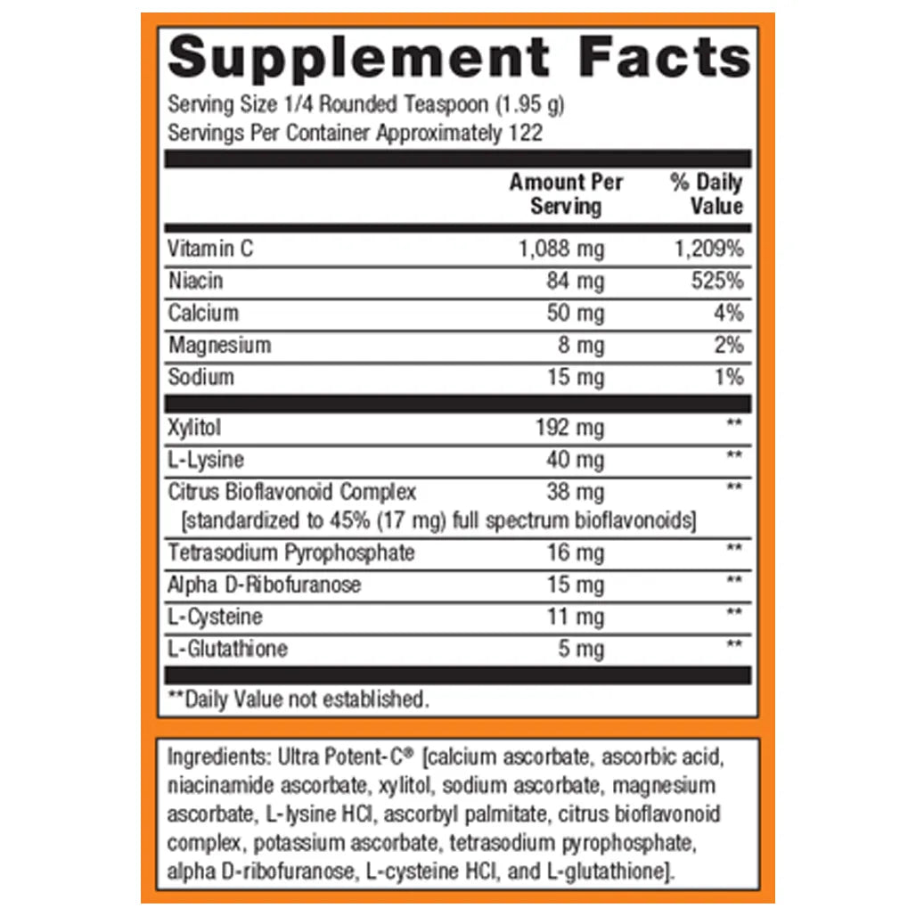 Ultra Potent-C® Powder is a proprietary, patented vitamin C formula that features a buffered delivery system designed to help prevent the potential stomach upset sometimes associated with high vitamin C intake. Ultra Potent-C Powder may help support healthy immune function and is a good source of antioxidants from vitamin C. Preliminary scientific research suggests that vitamin C in the form of Ultra Potent-C may result in improved uptake of the vitamin by white blood cells when compared to regular ascorbic acid.