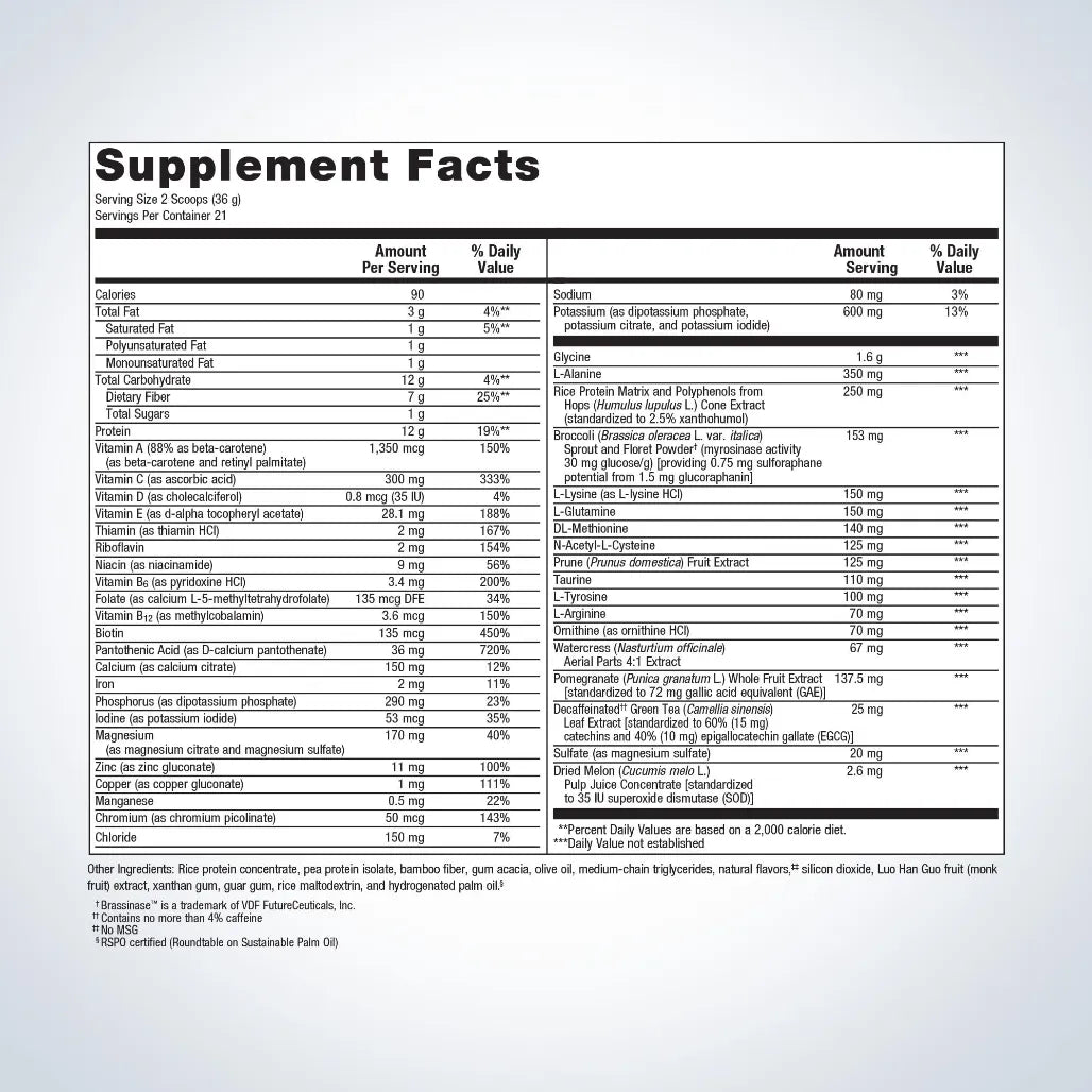 Amount Per Serving% Daily ValueCalories140Calories From Fat30Total Fat3 g5%Saturated Fat1 g5%Polyunsaturated1 gMonounsaturated Fat1 gTotal Carbohydrate17 g6%Dietary Fiber6 g24%Sugars4 gProtein12 gVitamin A (4,000 IU as beta-carotene and 500 IU as retinyl palmitate)4500 IU90%Vitamin C (as ascorbic acid)300 mg500%Vitamin D (as cholecalciferol)35 IU9%Vitamin E (as d-alpha tocopheryl acetate)42 IU140%Thiamin (as thiamin HCl)2 mg133%Riboflavin2 mg118%Niacin (as niacinamide)7 mg35%Vitamin B6 (as pyridoxine HCl)3.4 mg170%Folate (as calcium L-5-methyltetrahydrofolate)80 mcg20%Vitamin B12 (as methylcobalamin)3.6 mcg60%Biotin135 mcg45%Pantothenic Acid (as D-calcium pantothenate)36 mg360%Calcium (as calcium citrate)150 mg15%Iron2 mg11%Phosphorus (as dipotassium phosphate)290 mg29%Iodine (as potassium iodide)53 mcg35%Magnesium (as magnesium citrate and magnesium sulfate)170 mg43%Zinc (as zinc gluconate)11 mg73%Copper (as copper gluconate)1 mg50%Manganese0.5 mg25%Chromium (as chromium picolinate)50 mcg42%Chloride150 mg4%Sodium80 mg3%Potassium (as dipotassium phosphate, potassium citrate, and potassium iodide)600 mg17%Glycine1.6 gL-Alanine350 mgRice Protein Matrix250 mgPolyphenols from Hops (Humulus lupulus L.) Cone Extract (standardized to 2.5% xanthohumol)Broccoli (Brassica oleracea L. var. italica) Sprout and Floret Powder (myrosinase activity 30 mg glucose/g) [providing 0.75 mg sulforaphane potential from 1.5 mg glucoraphanin]153 mgL-Lysine (as L-lysine HCl)150 mgL-Glutamine150 mgDL-Methionine140 mgN-Acetyl-L-Cysteine125 mgPrune (Prunus domestica) Skin Extract125 mgTaurine110 mgL-Tyrosine100 mgL-Arginine70 mgOrnithine (as ornithine HCl)70 mgWatercress (Nasturtium officinale) Aerial Parts 4:1 Extract67 mgPomegranate (Punica granatum L.) Whole Fruit Extract [standardized to 72 mg gallic acid equivalent (GAE)]137.5 mgDecaffeinated††† Green Tea Leaf Extract (Camellia sinensis) [standardized to 60% (15 mg) catechins and 40% (10 mg) epigallocatechin gallate (EGCG)]25 mgSulfate (as magnesium sulfate)20 mgDried Melon (Cucumis melo L.) Pulp Juice Concentrate [standardized to 35 IU superoxide dismutase (SOD)2.6 mgUltraClear RENEW Vanilla Ingredients:Rice protein concentrate, pea protein isolate, isomalto-oligosaccharide, apple fiber, organic cane sugar, gum acacia, olive oil, medium-chain triglycerides, natural flavors, silica, xanthan gum, Luo Han Guo fruit (monk fruit) extract, guar gum, rice maltodextrin, hydrogenated palm oil